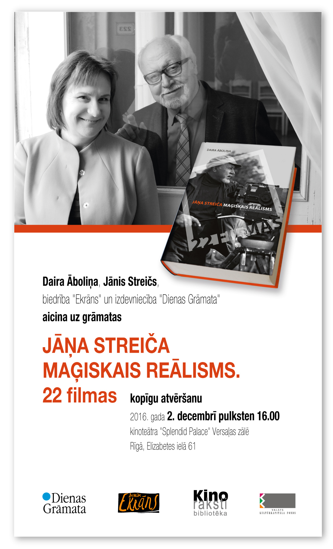 Publicēts: 23. November, 2016 Būsiet laipni gaidīti Dairas Āboliņas grāmatas “Jāņa Streiča maģiskais reālisms. 22 filmas” atvēršanas svētkos piektdien, 2. decembrī, pulksten 16.00