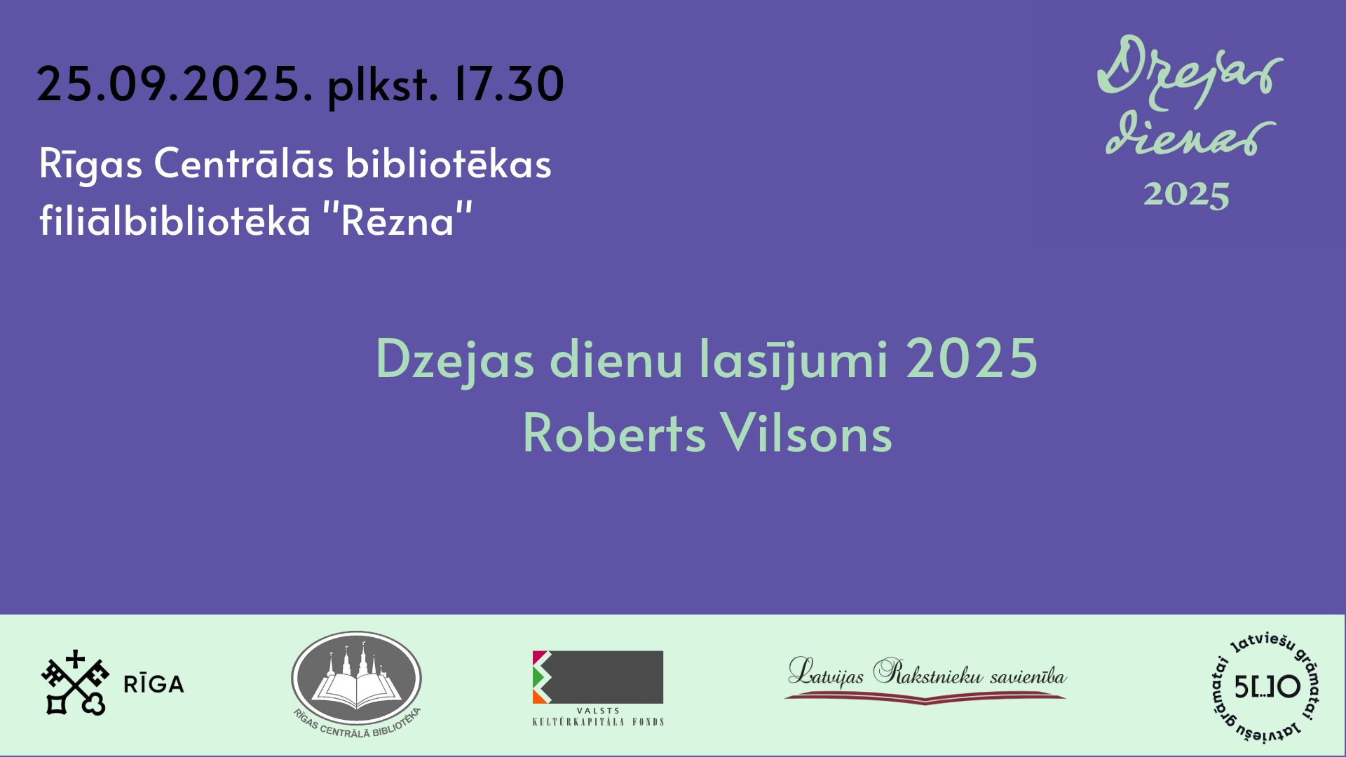 Latvijas Rakstnieku savienība sadarbībā ar Rīgas Centrālo bibliotēku rīko virkni pasākumu, lai atzīmētu Dzejas dienas 2025. 25. septembrī plkst. 17.30 RCB filiālbibliotēkā “Rēzna”, Valērijas Seiles ielā 14 uz lasījumu aicina dzejnieks Roberts Vilsons.