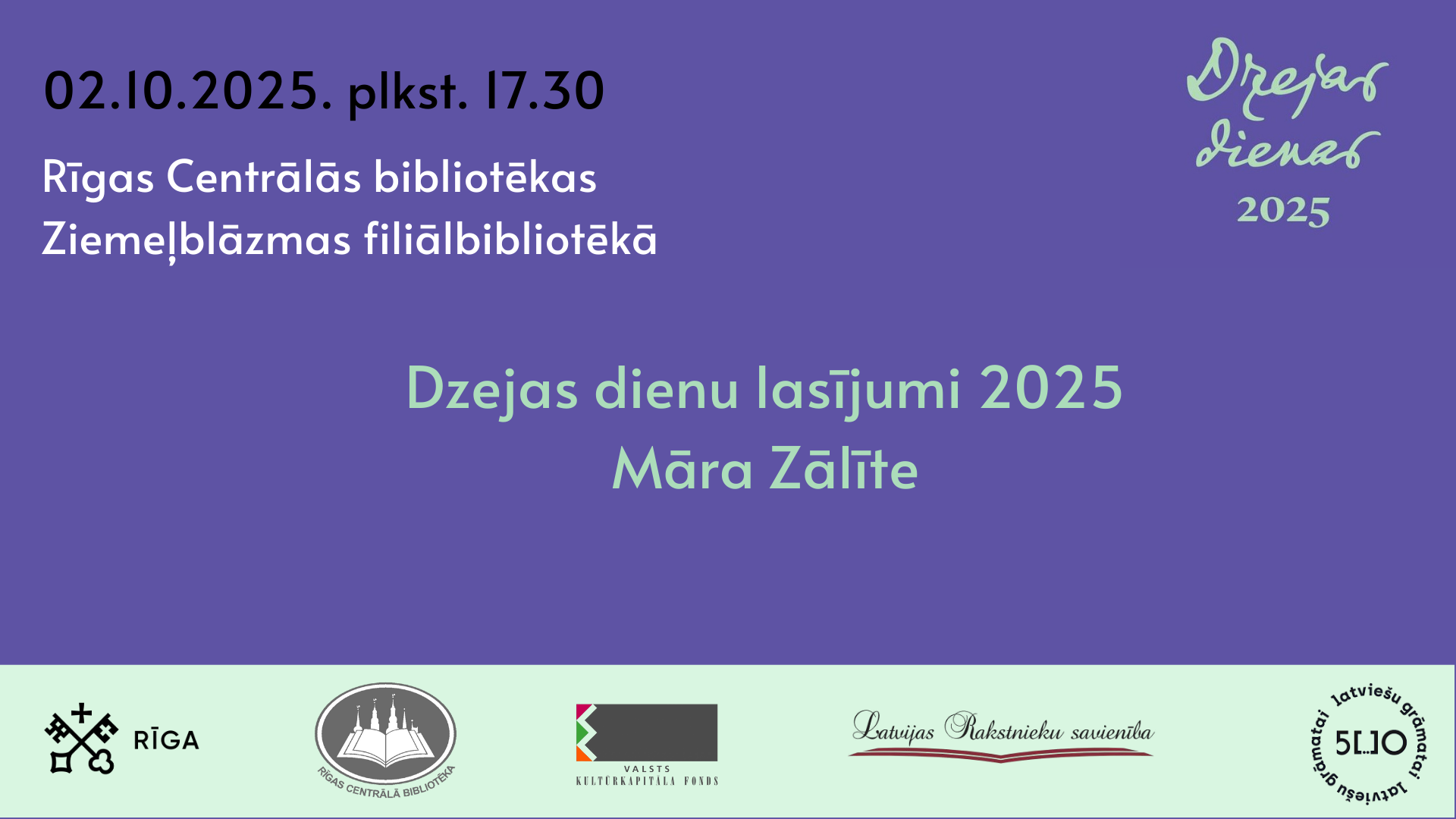 Latvijas Rakstnieku savienība sadarbībā ar Rīgas Centrālo bibliotēku rīko virkni pasākumu, lai atzīmētu Dzejas dienas 2025. 2. oktobrī plkst. 17.30 RCB Ziemeļblāzmas filiālbibliotekā, Ziemeļblāzmas ielā 36 uz lasījumu aicina dzejniece Māra Zālīte.