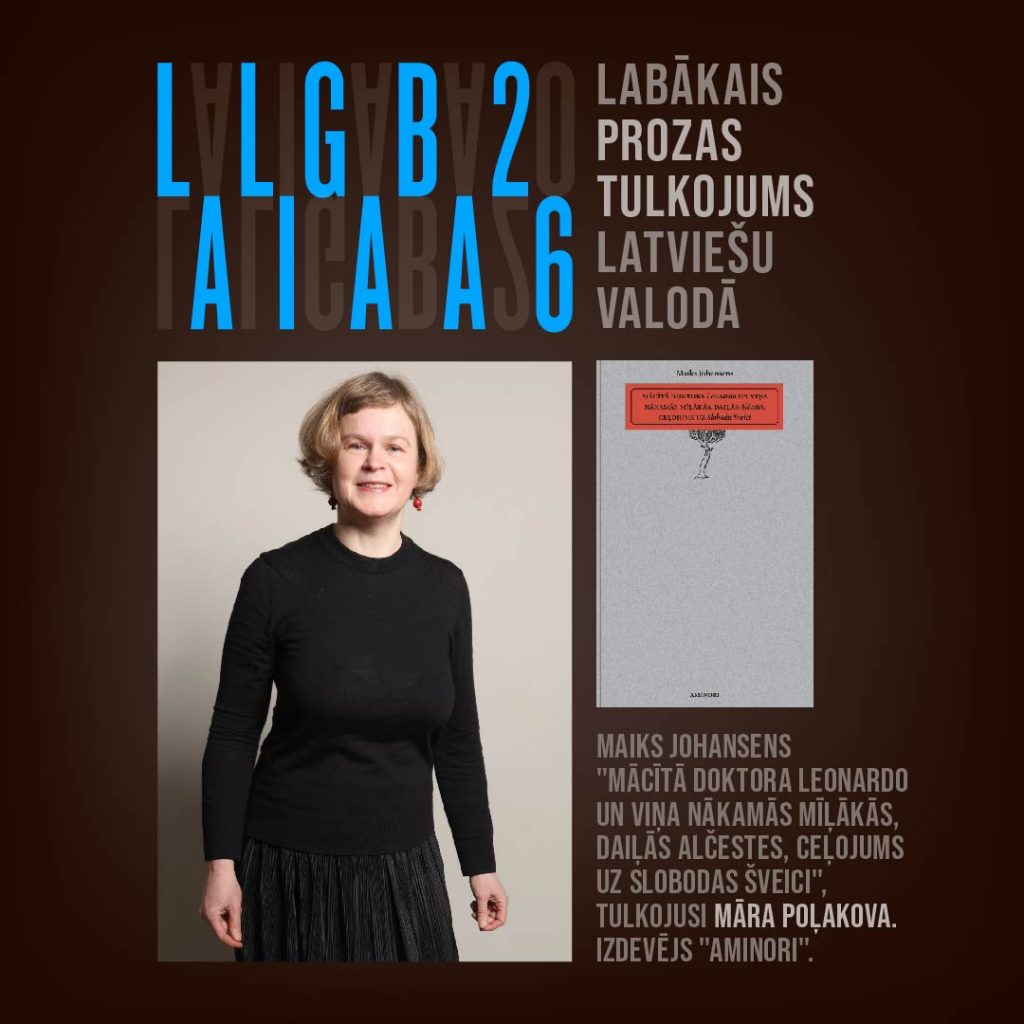 Nominācijā “Labākais prozas tulkojums latviešu valodā” balvu ieguva Māra Poļakova par Maika Johansena romāna “Mācītā doktora Leonardo un viņa nākamās mīļākās, daiļās Alčestes, ceļojums uz Slobodas Šveici” tulkojumu. Romānu izdevis apgāds “Aminori”. Balva piešķirta par valodiski niansētu, rūpīgu un meistarīgu tulkotājas darbu, kas nozīmīgi paplašina lasītāja ukraiņu literatūras pieredzi un bagātina latviešu valodu.